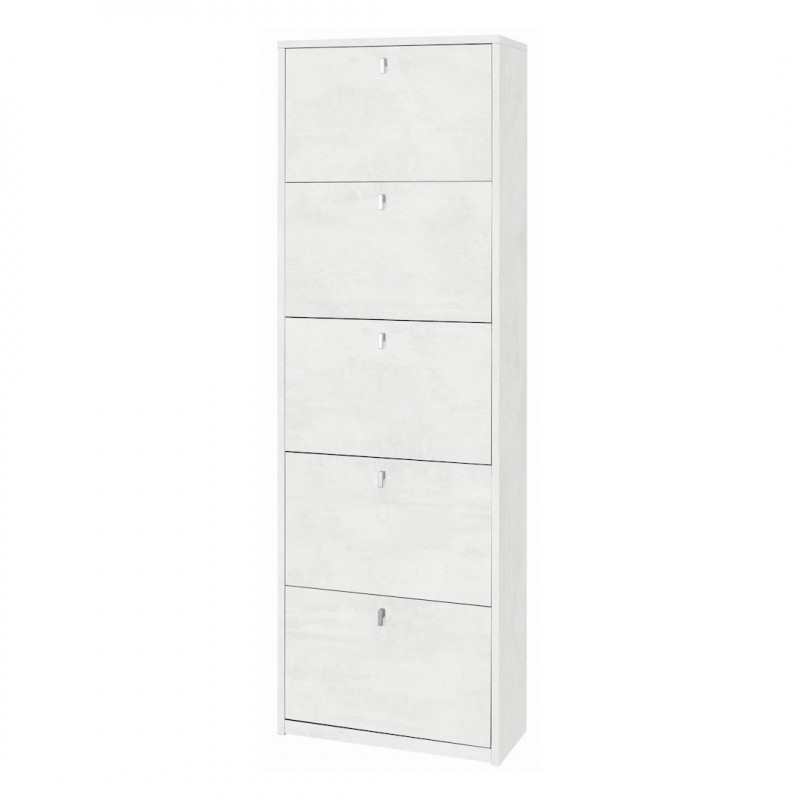 Scarpiera in kit con struttura e ante in bianco opaco, con 5 ante a ribalta doppia profondità e capacità fino a 25 paia di scarpe. Pomoli verniciati cromo platinato. Fianchi e top a vista, bordi ABS senza angolo vivo. Design funzionale e moderno.
