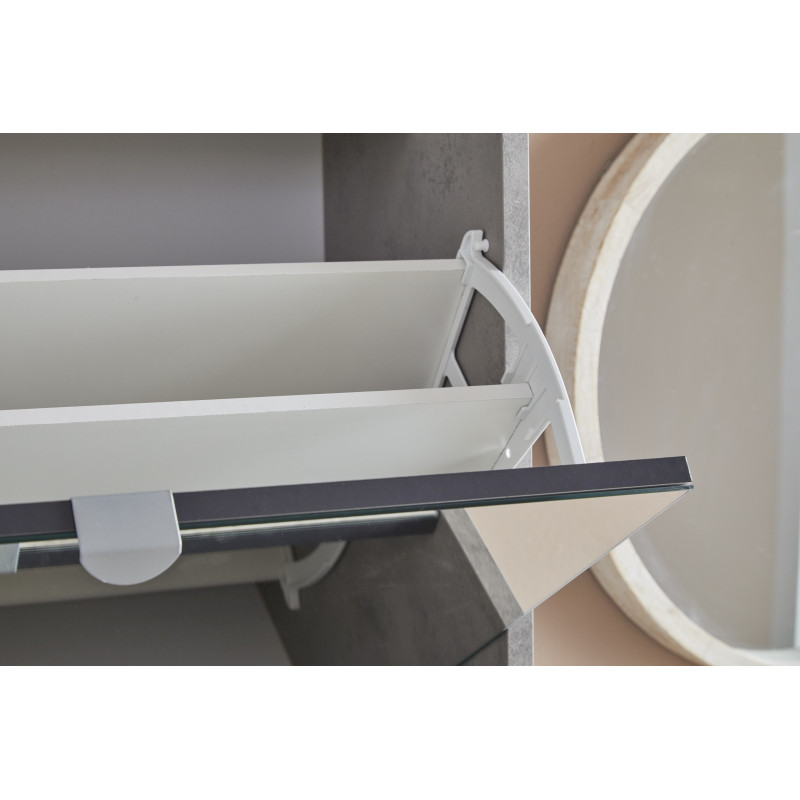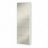 Scarpiera in kit con struttura bianco opaco e ante con specchio. Comprende 5 ante a ribalta singola profondità e capacità fino a 25 paia di scarpe. Maniglie in alluminio e bordi ABS. Soluzione pratica e luminosa per l’ingresso o il corridoio.