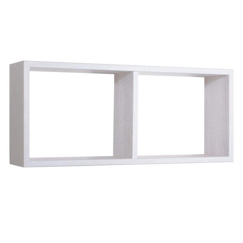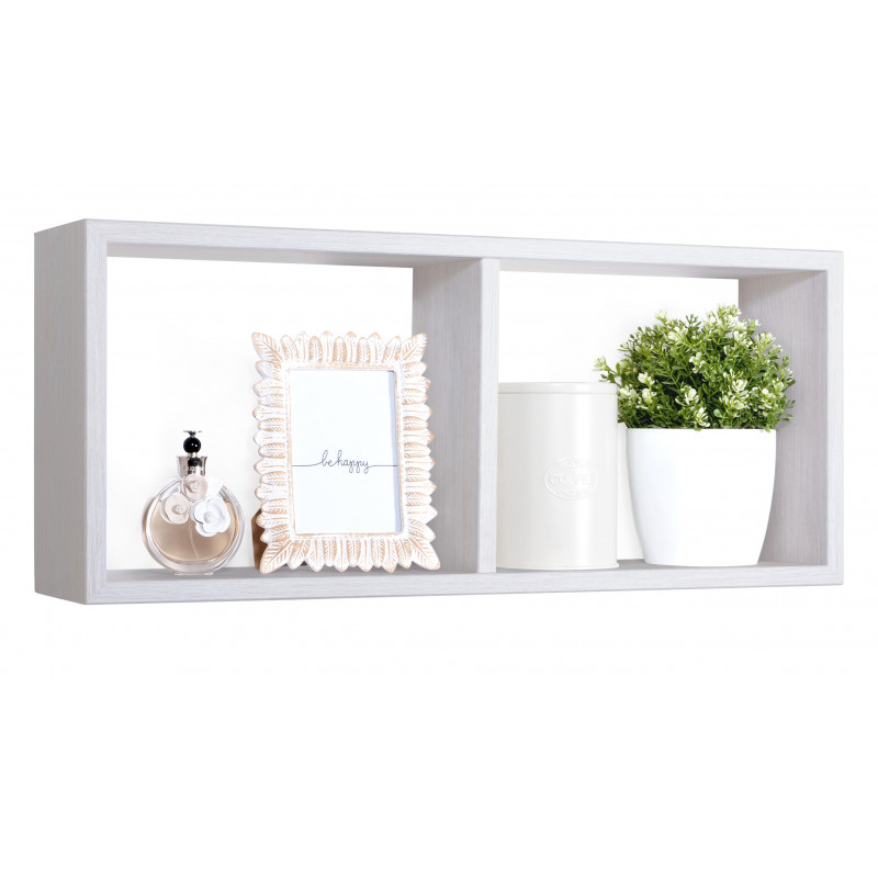 La struttura in fibra di legno con finitura rivestita (spessore 18 mm) assicura stabilità e una finitura uniforme; il fissaggio a scomparsa lascia la parete pulita e permette installazioni singole o in composizione. Un divisorio centrale crea due vani per separare libri e oggetti.