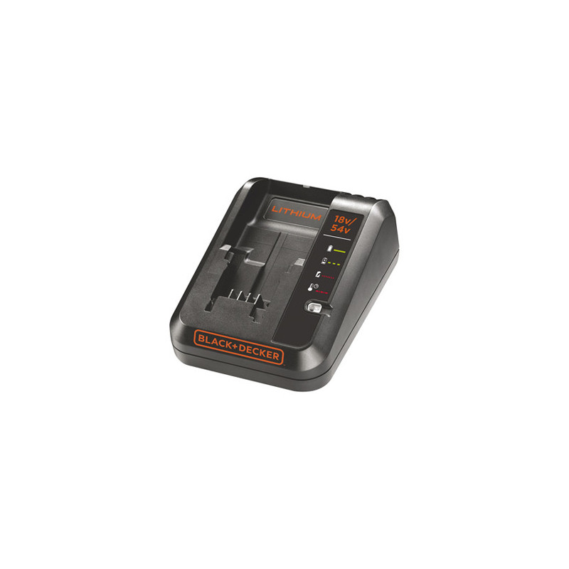 Caricabatterie Dual Volt 2 A per batterie Li-Ion 18 V e 54 V, compatibile con sistemi Black & Decker e Dewalt.