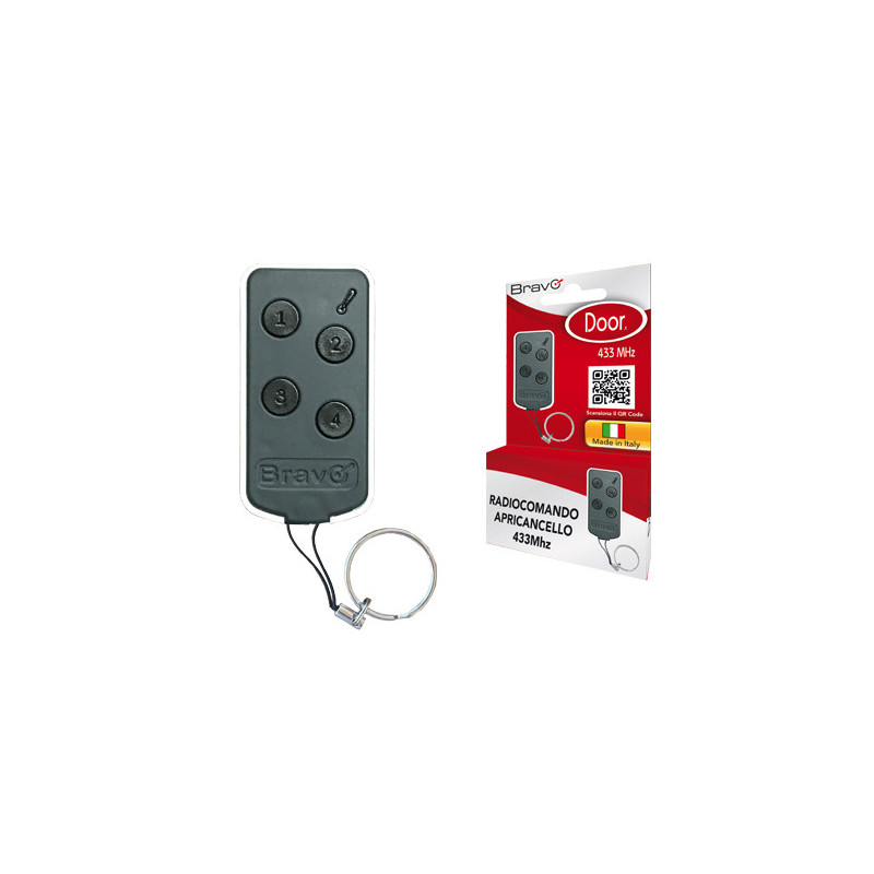 Radiocomando Bravo DoorX con 4 canali, funzionamento a 433 MHz con codice fisso.