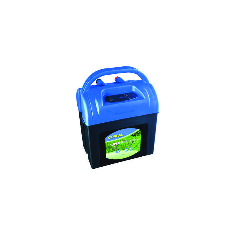 L'elettrificatore Corral Super B170 è progettato per recinzioni corte con poca vegetazione, funzionando con batteria a secco da 9V o batteria da 12V tramite adattatore (non incluso).