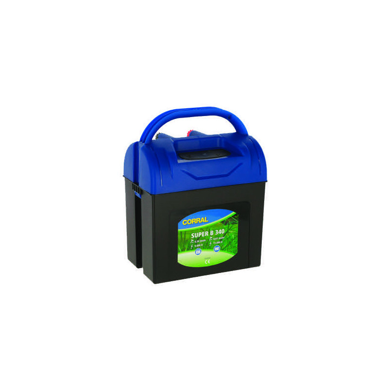 Il Corral Super B340 è un elettrificatore potente per recinzioni fino a 4 km, con alimentazione a batteria 9V/12V o corrente 230V (trasformatore incluso).