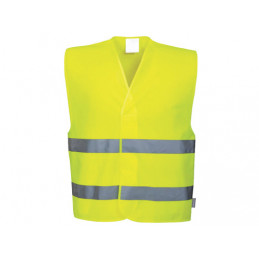 Gilet alta visibilità giallo in rete trivalente con bande riflettenti.
