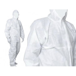Tuta monouso in TNT taglia L con cappuccio, chiusura a zip frontale ed elastici su polsi, caviglie e cappuccio.