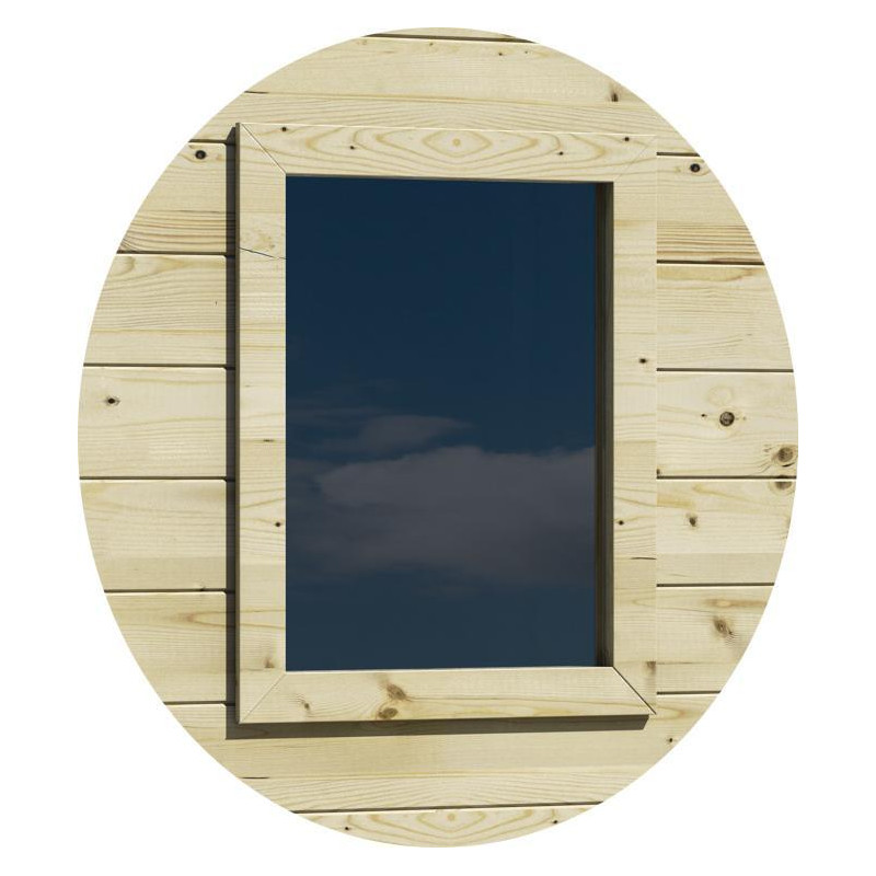 Kit finestra per casetta Stefy con serramento realizzato in abete massello naturale completo di vetro fisso in plexiglass, ideale come accessorio o ricambio per casette da giardino e spazi esterni.