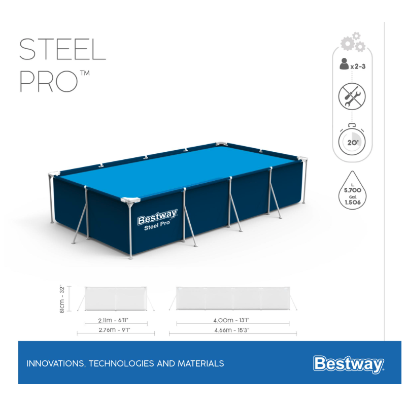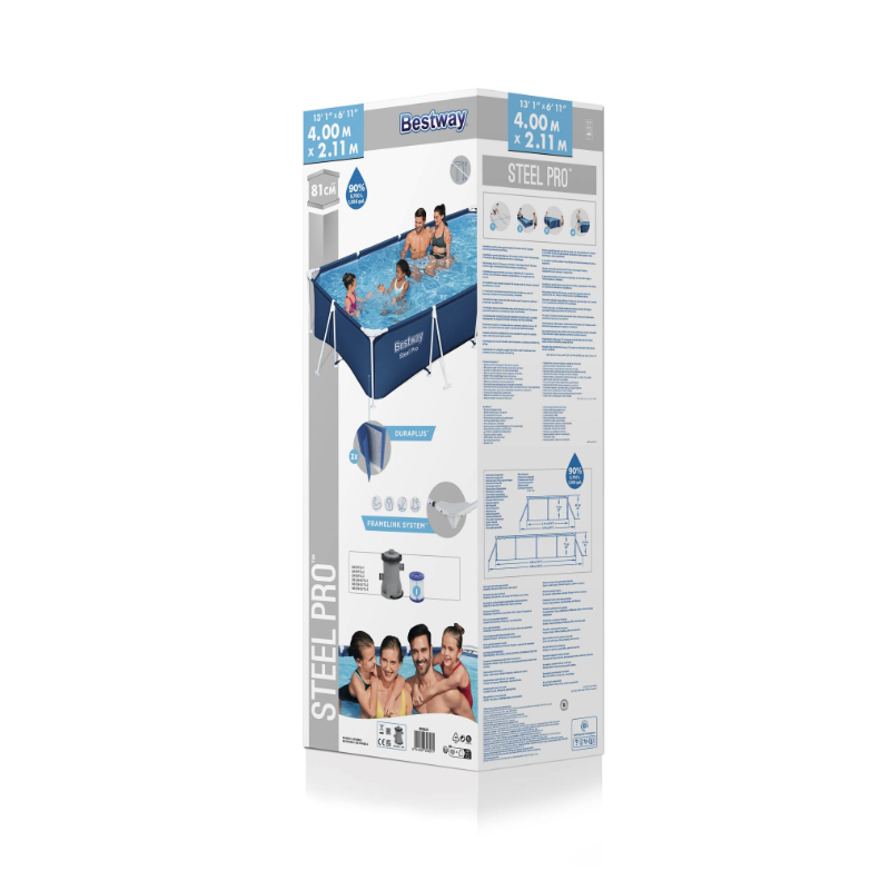 Con dimensioni di 400x211 cm e altezza di 81 cm permette un livello d’acqua confortevole per il relax e il gioco durante la stagione calda.