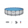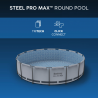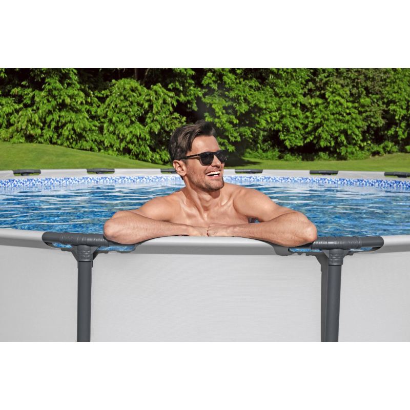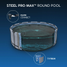 Piscina fuori terra rotonda con struttura in acciaio progettata per offrire elevata capacità, stabilità e comfort durante l’utilizzo estivo in giardino o negli spazi esterni domestici.