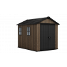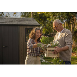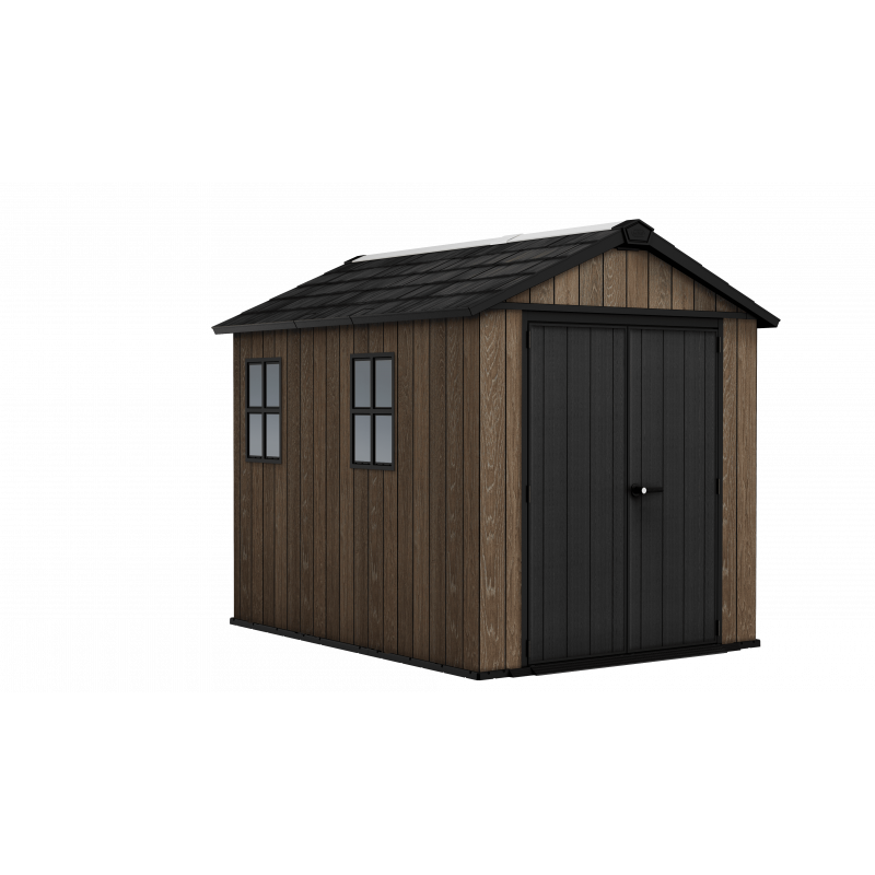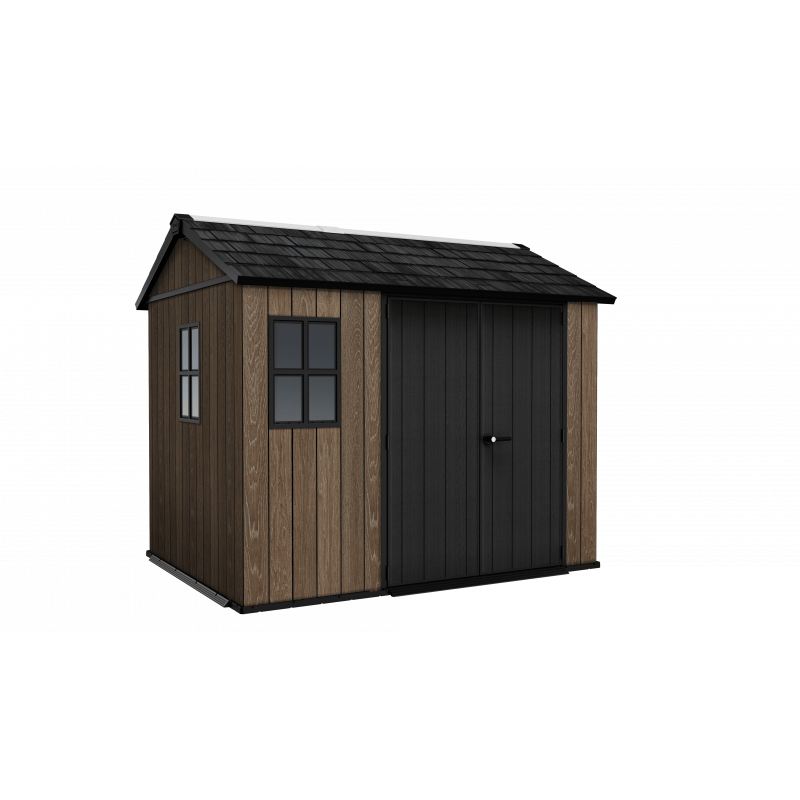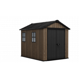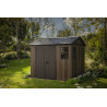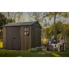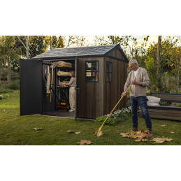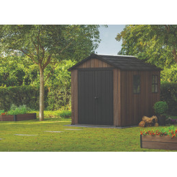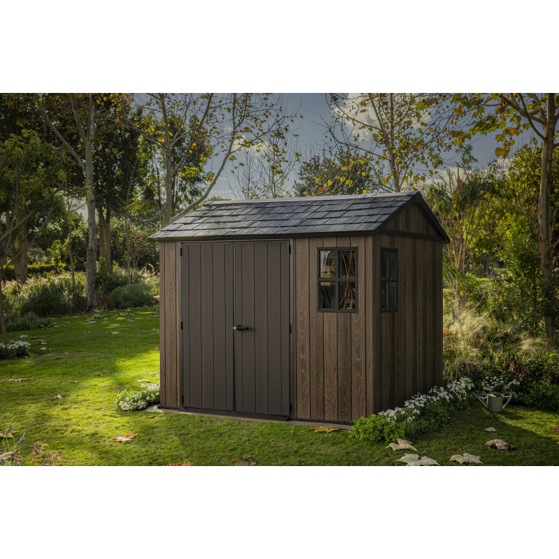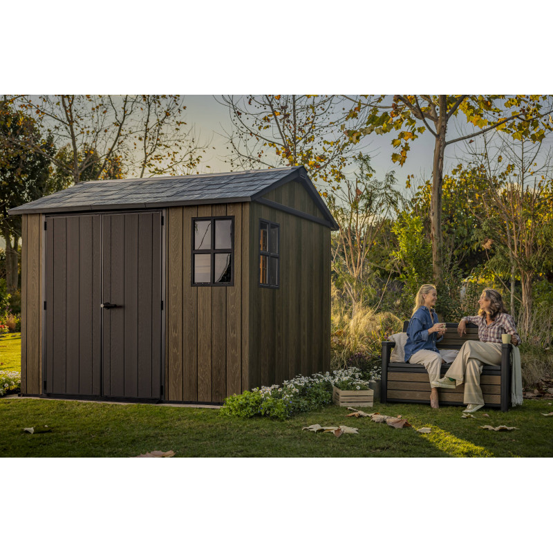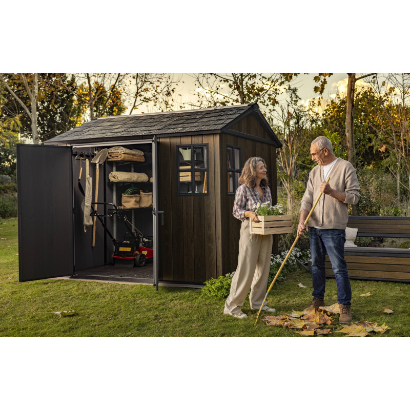 Progettata per garantire ampio spazio di stoccaggio e resistenza strutturale, questa casetta in resina effetto legno con finitura Signature Walnut valorizza il giardino con un’estetica naturale e raffinata.