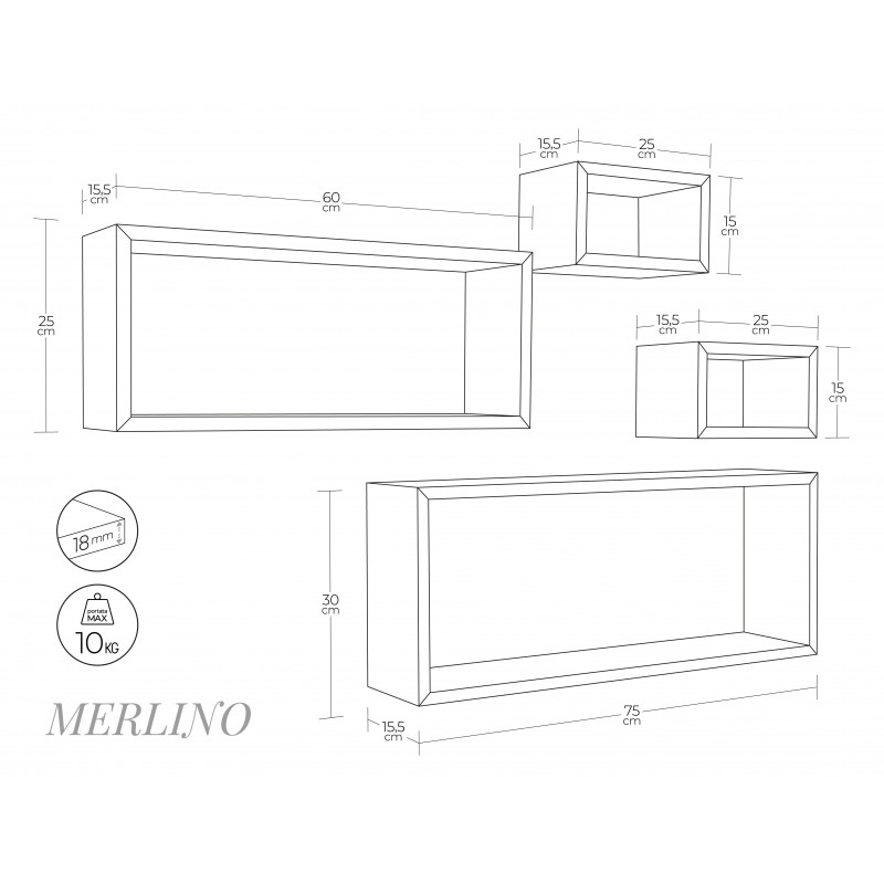 Dimensioni: un modulo 75 × 30 × P 15,5 cm, un modulo 60 × 25 × P 15,5 cm e due moduli 25 × 15 × P 15,5 cm.