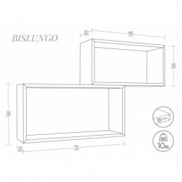 Portata massima 10 kg per mensola. Dimensioni: una mensola 70 × 35 × P 20 cm e una 60 × 30 × P 20 cm.