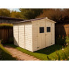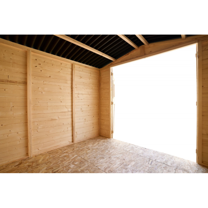 Materiale: abete rosso massiccio (Picea – fam. Pinaceae) non trattatoColore: legno naturalePareti: tavolame scanalato con linguette, spessore 20 mm, taglio chaletBase a terra: 300 x 184 cm (5,83 m²)Superficie utile interna: 280 x 164 cm (4,59 m²)Dimensioni esterne totali: 310 x 188 cmAltezza parete: 1,71 mAltezza colmo: 1,97 mSporgenza tetto: anteriore e...