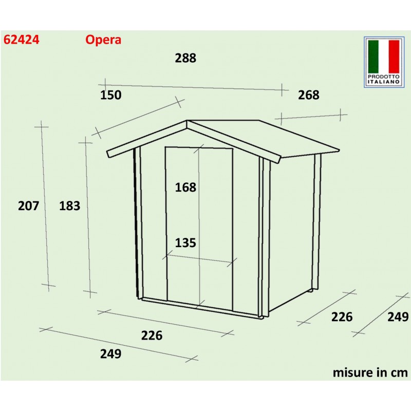 Dimensioni tecniche:-Spessore parete 16 mm-Larghezza esterna (A) 155 cm-Profondità esterna (B) 85 cm-Larghezza interna (C) 140 cm-Profondità interna (D) 70 cm-Superficie interna 0,98 mq-Altezza minima (h1) 145 cm-Altezza massima (h2) 165 cm-Lunghezza gronda (G) 167 cm-Sviluppo falda (S) 98 cm-Superfice tetto 1,64 mq-Pavimento incluso