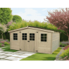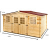Materiale: abete rosso massiccio (Picea – fam. Pinaceae) non trattatoColore: legno naturalePareti: tavolame scanalato con linguette, spessore 20 mm, taglio chaletBase a terra: 300 x 184 cm (5,83 m²)Superficie utile interna: 280 x 164 cm (4,59 m²)Dimensioni esterne totali: 310 x 188 cmAltezza parete: 1,71 mAltezza colmo: 1,97 mSporgenza tetto: anteriore e...