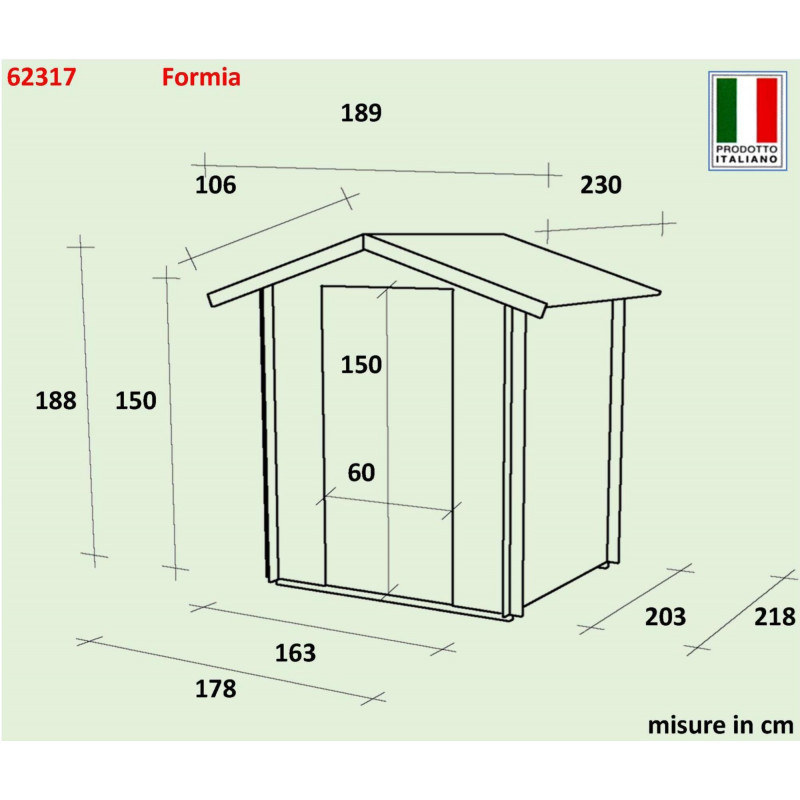 Dimensioni tecniche:-Spessore parete 16 mm-Larghezza esterna (A) 155 cm-Profondità esterna (B) 85 cm-Larghezza interna (C) 140 cm-Profondità interna (D) 70 cm-Superficie interna 0,98 mq-Altezza minima (h1) 145 cm-Altezza massima (h2) 165 cm-Lunghezza gronda (G) 167 cm-Sviluppo falda (S) 98 cm-Superfice tetto 1,64 mq-Pavimento incluso