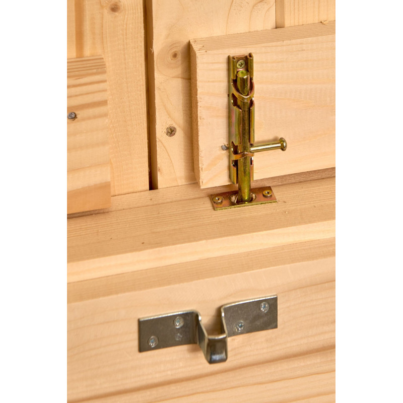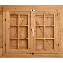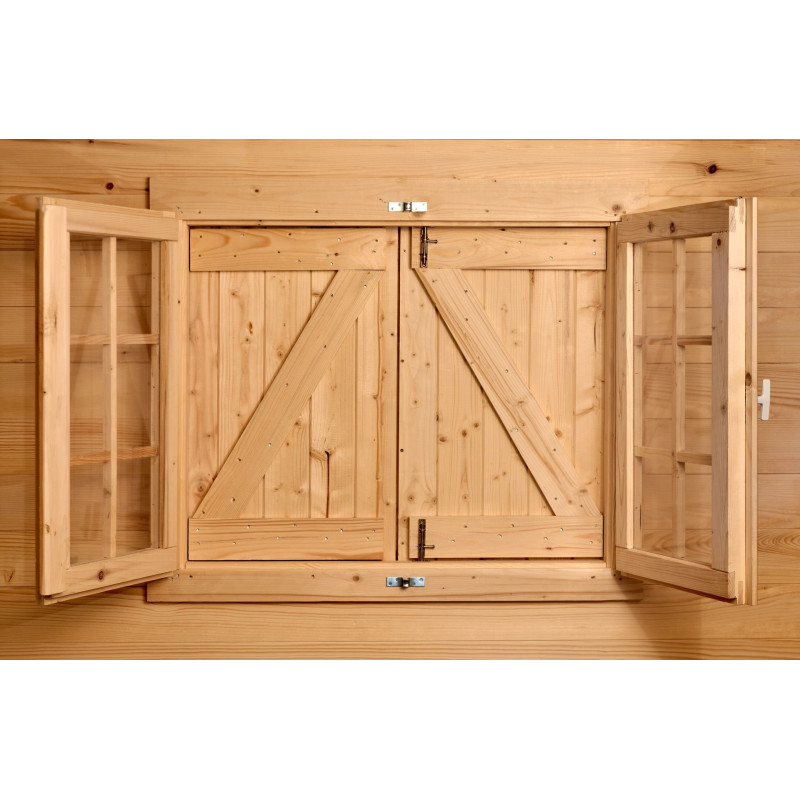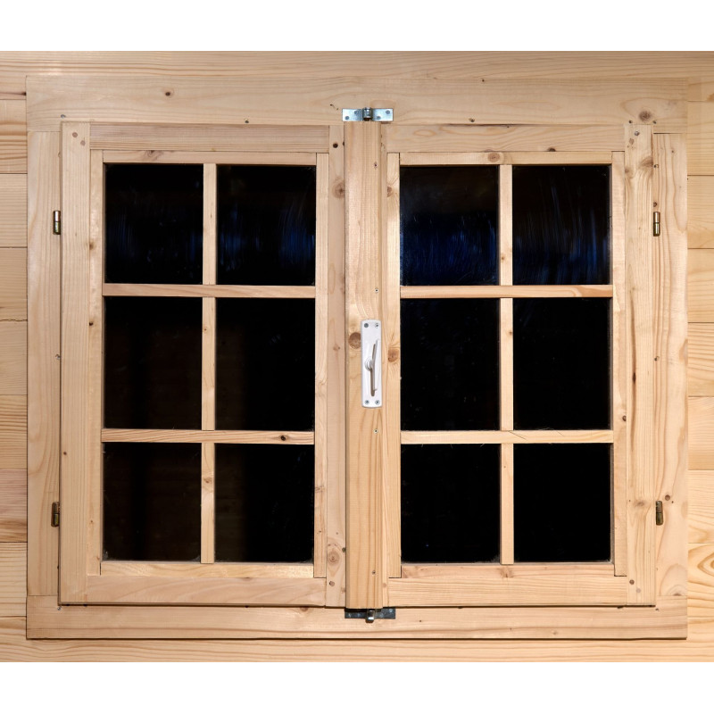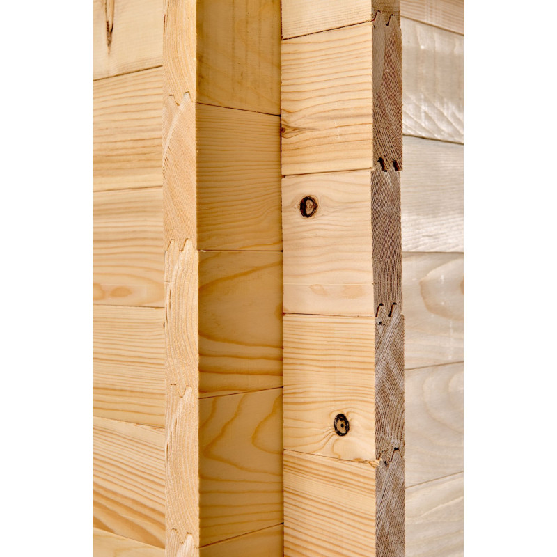 Materiale: abete rosso massiccio non trattatoColore: legno naturaleTrattamento: da effettuare con vernice antimuffa e antitarmePareti: pannelli preassemblati in abete piallato con incastro maschio/femmina, spessore 16 mm, telaio 25 x 25 mmPavimento: truciolare trattato da 12 mm su 5 travetti in legno massello 25 x 40 mmBase a terra: 240 x 240 cm (5,76...