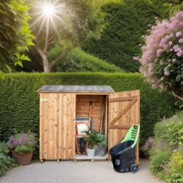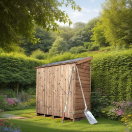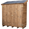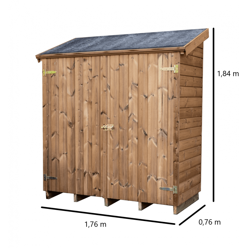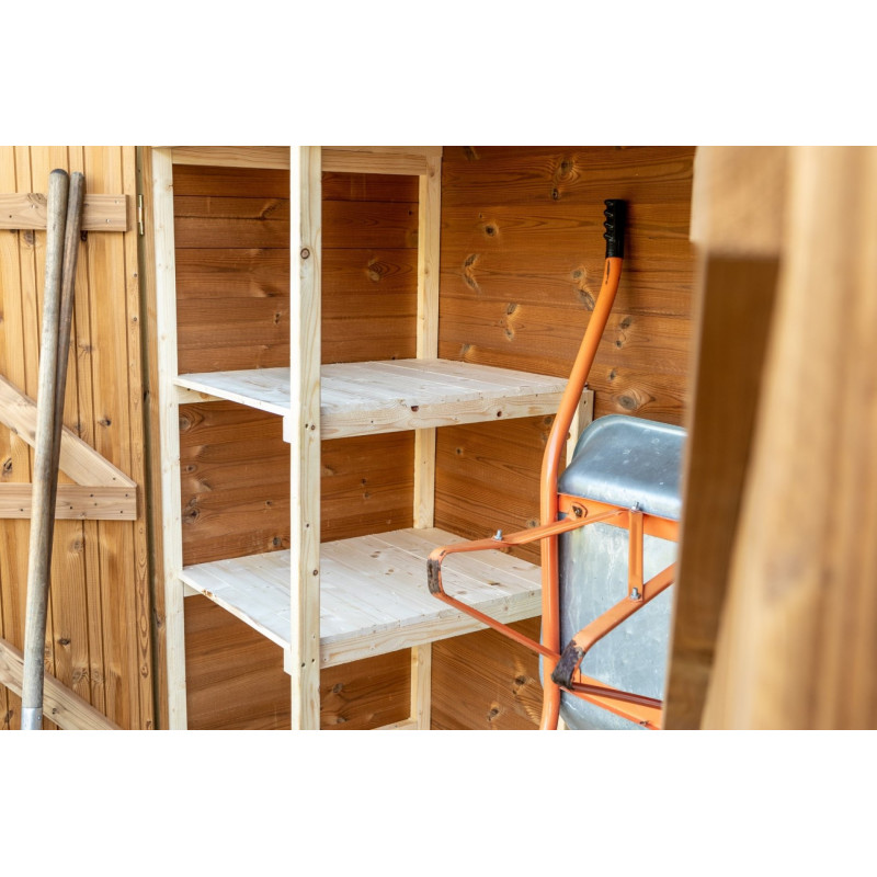 Materiale: abete termo-trattato a 215°C, naturale e senza prodotti chimiciColore: bruno-doratoPareti: pannelli preassemblati da 19 mm con incastro scanalato su telaio 45x30 mmBase a terra: 120 x 60 cm (0,72 m²)Superficie utile interna: 116 x 56 cm (0,65 m²)Dimensioni totali: 124 x 67 cmAltezza pareti: 1,72 mAltezza colmo: 1,95 mTetto: doppia falda con...