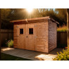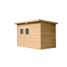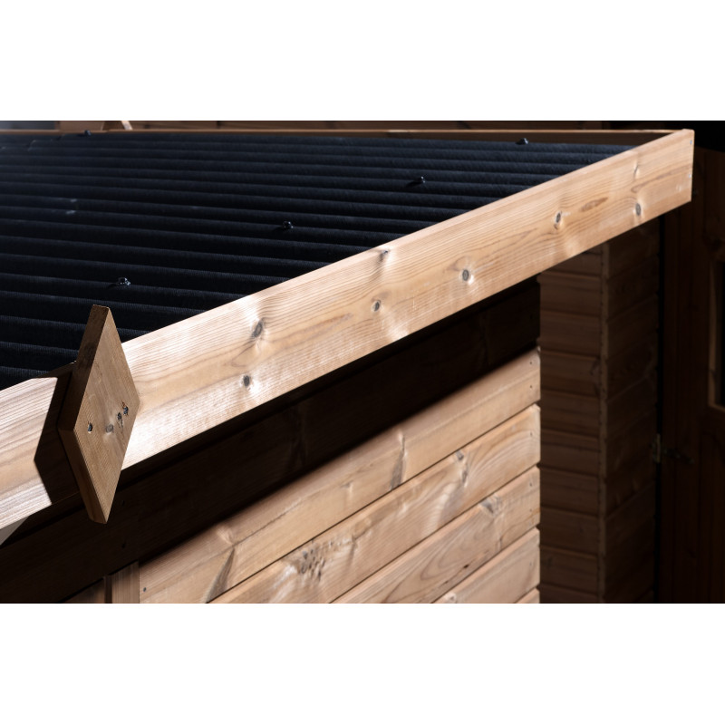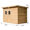 Materiale: picea termo-trattato a 215°C, senza additivi chimiciColore: legno naturale bruno-doratoPareti: pannelli prefabbricati spessore 19 mm, su telaio 45x30 mmBase a terra: 236 x 200 cm (4,72 m²)Superficie utile interna: 230 x 194 cm (4,46 m²)Dimensioni totali: 271 x 260 cmAltezza pareti: 1,82 mAltezza colmo: 2,24 mTetto: doppia falda, copertura in...