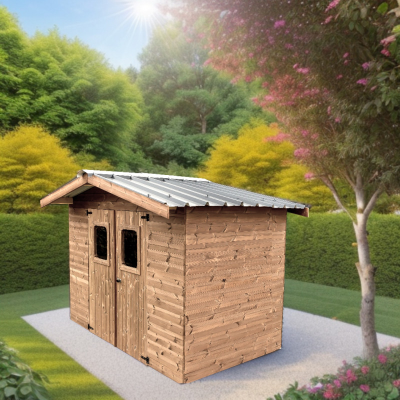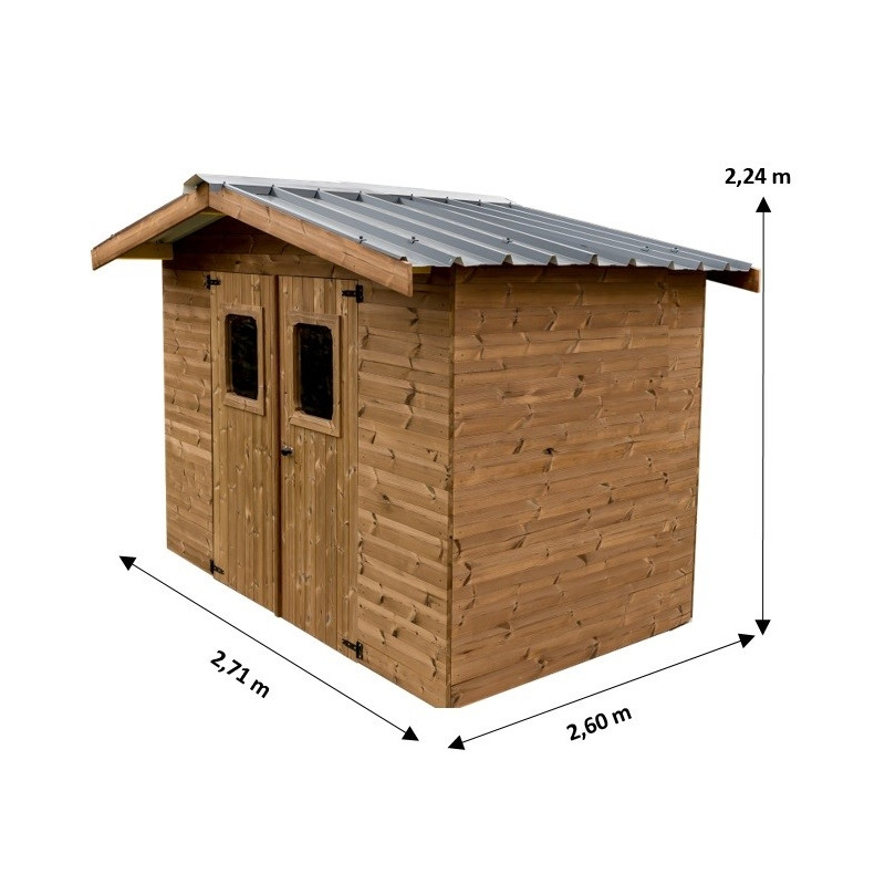 Materiale: abete termo-trattato a 215°C, naturale e senza prodotti chimiciColore: bruno-doratoPareti: pannelli preassemblati da 19 mm con incastro scanalato su telaio 45x30 mmBase a terra: 120 x 60 cm (0,72 m²)Superficie utile interna: 116 x 56 cm (0,65 m²)Dimensioni totali: 124 x 67 cmAltezza pareti: 1,72 mAltezza colmo: 1,95 mTetto: doppia falda con...
