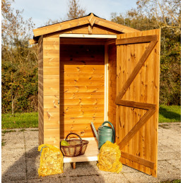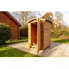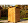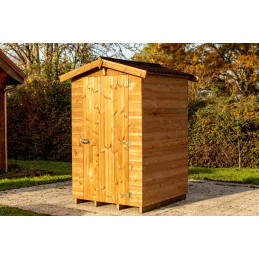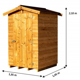 Materiale: abete termo-trattato a 215°C, naturale e senza prodotti chimiciColore: bruno-doratoPareti: pannelli preassemblati da 19 mm con incastro scanalato su telaio 45x30 mmBase a terra: 120 x 60 cm (0,72 m²)Superficie utile interna: 116 x 56 cm (0,65 m²)Dimensioni totali: 124 x 67 cmAltezza pareti: 1,72 mAltezza colmo: 1,95 mTetto: doppia falda con...