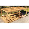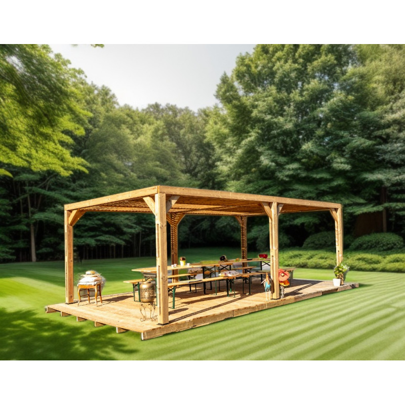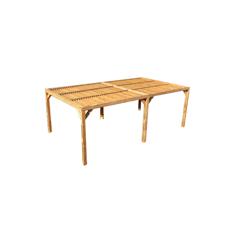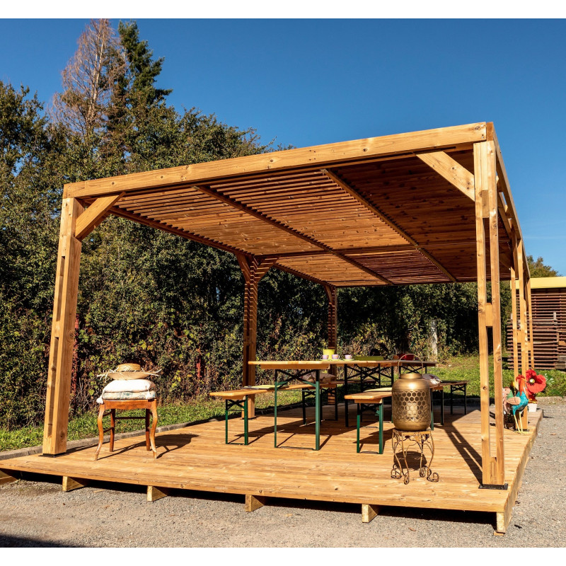 Materiale: Legno lamellare di abete e douglasDimensioni esterne: 339 x 360 cmSuperficie coperta: 12,2 m²Altezza passaggio: 2,05 mAltezza colmo: 2,17 mCopertura: Doghe in douglas regolabili, sezione 20 x 95 mmPali: Sezione 120 x 120 mm, legno lamellareTravi: Sezione 120 x 45 mm, abete rosso trattatoTrattamento: Non trattato, da impregnare dopo il...