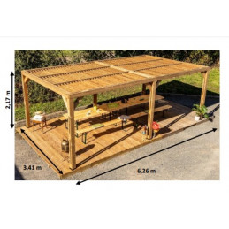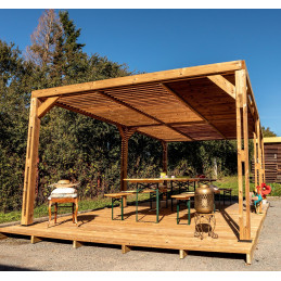 Materiale: Legno lamellare di abete e douglasDimensioni esterne: 339 x 360 cmSuperficie coperta: 12,2 m²Altezza passaggio: 2,05 mAltezza colmo: 2,17 mPali: Sezione 120 x 120 mmMontanti: Sezione 120 x 45 mm, abete trattatoDoghe tetto: 3 moduli orientabili in abete, sezione 18 x 95 mmDoghe laterali: 3 moduli orientabili in douglas, sezione 20 x 95...