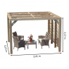 Materiale: abete termo-trattato a 215°CColore: bruno dorato naturaleStruttura: pali 70 x 80 mm – travi equidistanti da 74 cmDimensioni totali: 300 x 296 cm (superficie tetto: 8,88 m²)Base consigliata: 319 x 315 cm (10,05 m²)Altezza totale: 2,35 mAltezza utile (con platine metalliche): 2,24 mLarghezza di passaggio: 2,80 mCopertura: non inclusa – da...