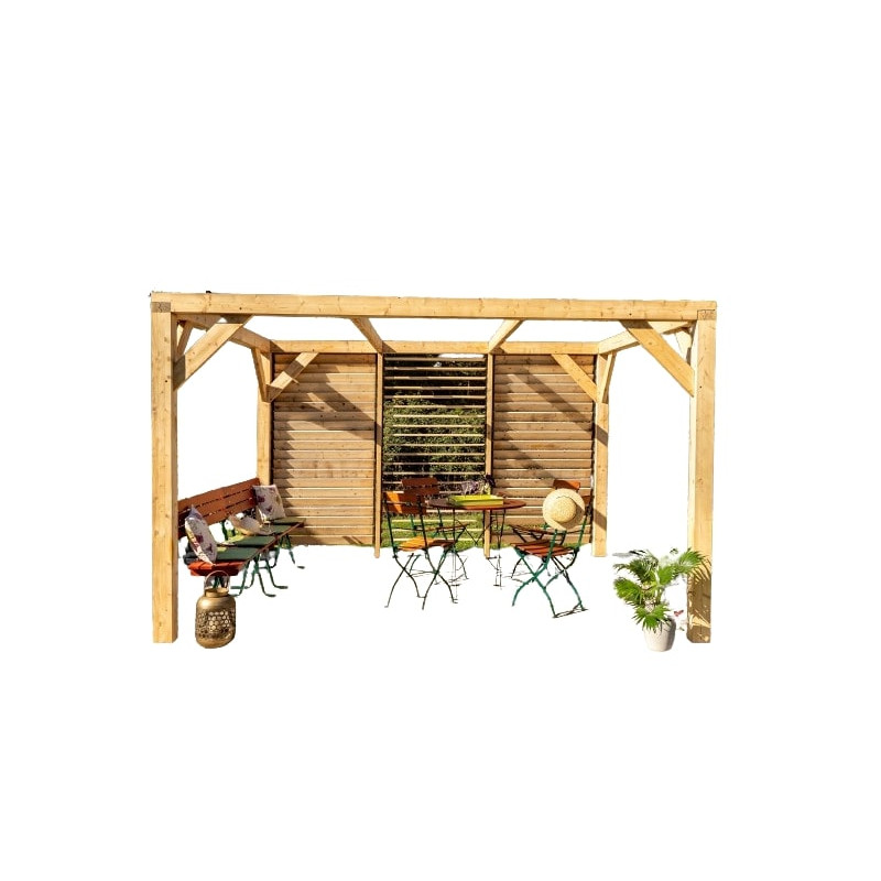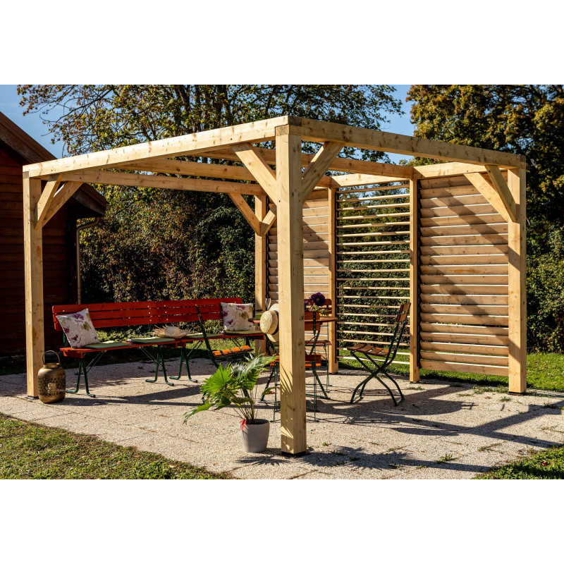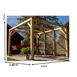 Materiale: Legno lamellare di abete e douglasDimensioni esterne: 339 x 360 cmSuperficie coperta: 12,2 m²Altezza passaggio: 2,05 mAltezza colmo: 2,17 mCopertura: Doghe in douglas regolabili, sezione 20 x 95 mmPali: Sezione 120 x 120 mm, legno lamellareTravi: Sezione 120 x 45 mm, abete rosso trattatoTrattamento: Non trattato, da impregnare dopo il...