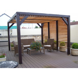Materiale: Legno lamellare di abete e douglasDimensioni esterne: 339 x 360 cmSuperficie coperta: 12,2 m²Altezza passaggio: 2,05 mAltezza colmo: 2,17 mCopertura: Doghe in douglas regolabili, sezione 20 x 95 mmPali: Sezione 120 x 120 mm, legno lamellareTravi: Sezione 120 x 45 mm, abete rosso trattatoTrattamento: Non trattato, da impregnare dopo il...