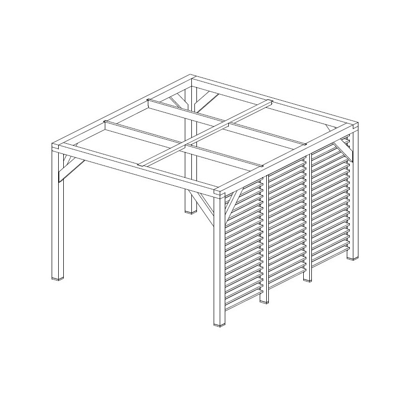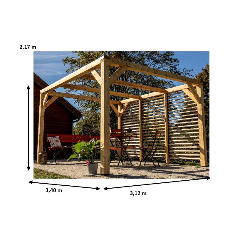 Materiale: Legno lamellare di abete e douglasDimensioni esterne: 339 x 360 cmSuperficie coperta: 12,2 m²Altezza passaggio: 2,05 mAltezza colmo: 2,17 mCopertura: Doghe in douglas regolabili, sezione 20 x 95 mmPali: Sezione 120 x 120 mm, legno lamellareTravi: Sezione 120 x 45 mm, abete rosso trattatoTrattamento: Non trattato, da impregnare dopo il...