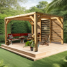 Materiale: Legno lamellare di abete rosso non trattatoDimensioni a terra: 339 x 360 cmSuperficie coperta: 12,2 m²Altezza passaggio: 2,05 mAltezza colmo: 2,17 mDoghe regolabili: su tetto e parete lateraleColore: Legno naturaleCertificazioni: PEFC – legno da foreste sostenibiliOrigine: Prodotto fabbricato in FranciaPeso: 410 kgImballo: Pallet 370 x 120 x 45 cm