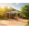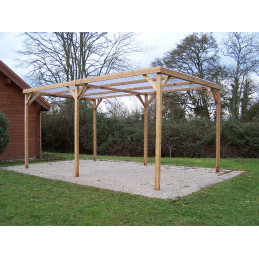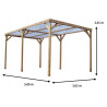 Materiale: Legno lamellare di abete e douglasDimensioni esterne: 339 x 360 cmSuperficie coperta: 12,2 m²Altezza passaggio: 2,05 mAltezza colmo: 2,17 mCopertura: Doghe in douglas regolabili, sezione 20 x 95 mmPali: Sezione 120 x 120 mm, legno lamellareTravi: Sezione 120 x 45 mm, abete rosso trattatoTrattamento: Non trattato, da impregnare dopo il...