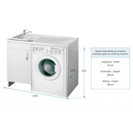 Materiale mobile: Nobilitato idrofugo W100, spessore 18 mmMateriale vasca e asse: Polipropilene resistente agli acidiDimensioni complessive: Larghezza 109 cm, profondità 60 cm, altezza 89 cmColore: BiancoPosizione vasca: DestraSpazio per lavatrice: 61 cm (larghezza), 59 cm (profondità), 85 cm (altezza)Rubinetto: Non incluso, vasca predispostaSifone:...