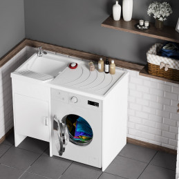Materiale mobile: Nobilitato idrofugo W100, spessore 18 mmMateriale vasca e asse: Polipropilene resistente agli acidiDimensioni complessive: Larghezza 109 cm, profondità 60 cm, altezza 89 cmColore: BiancoPosizione vasca: DestraSpazio per lavatrice: 61 cm (larghezza), 59 cm (profondità), 85 cm (altezza)Rubinetto: Non incluso, vasca predispostaSifone:...