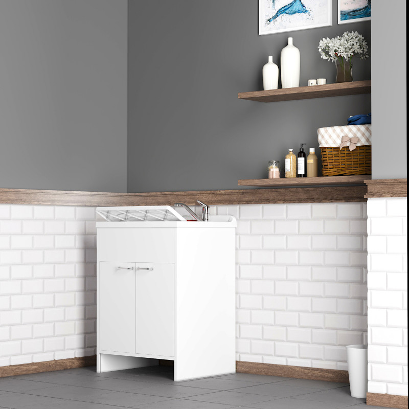 Materiale mobile: Nobilitato idrofugo W100, spessore 18 mmMateriale vasca e asse: Polipropilene resistente agli acidiDimensioni: Larghezza 60 cm, profondità 50 cm, altezza 85 cmColore: BiancoManiglie: CromatePiedini: Regolabili in altezzaRubinetto: Non incluso, vasca predispostaSifone: Autopulente con piletta e troppopienoInstallazione: Da interno