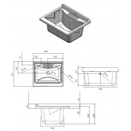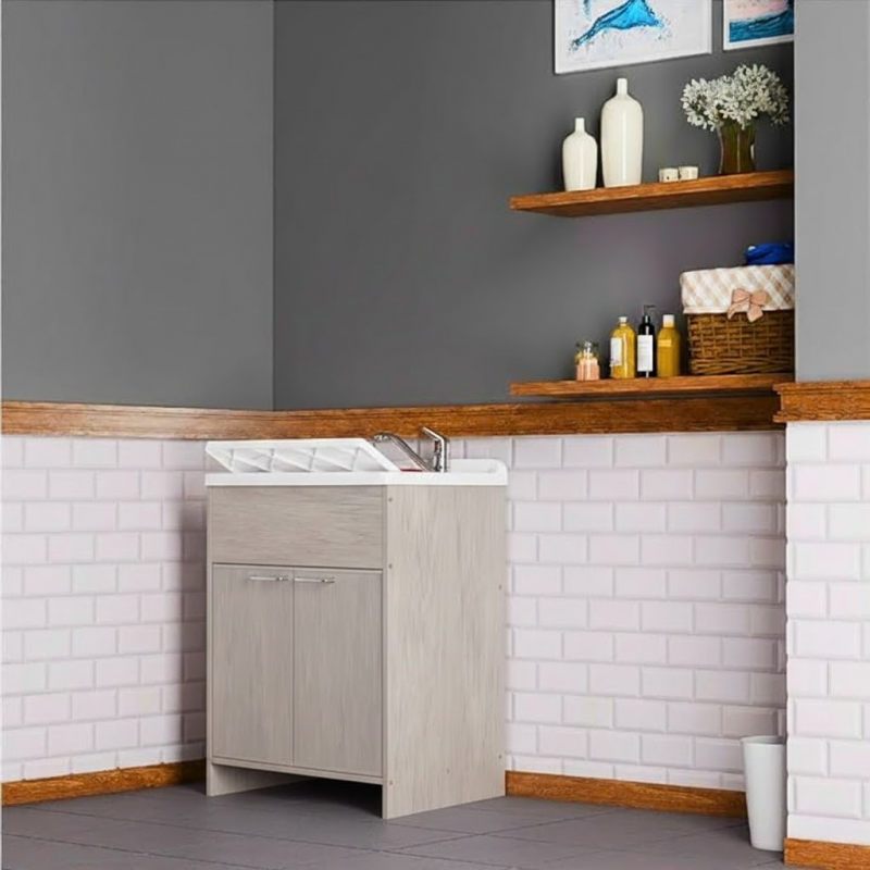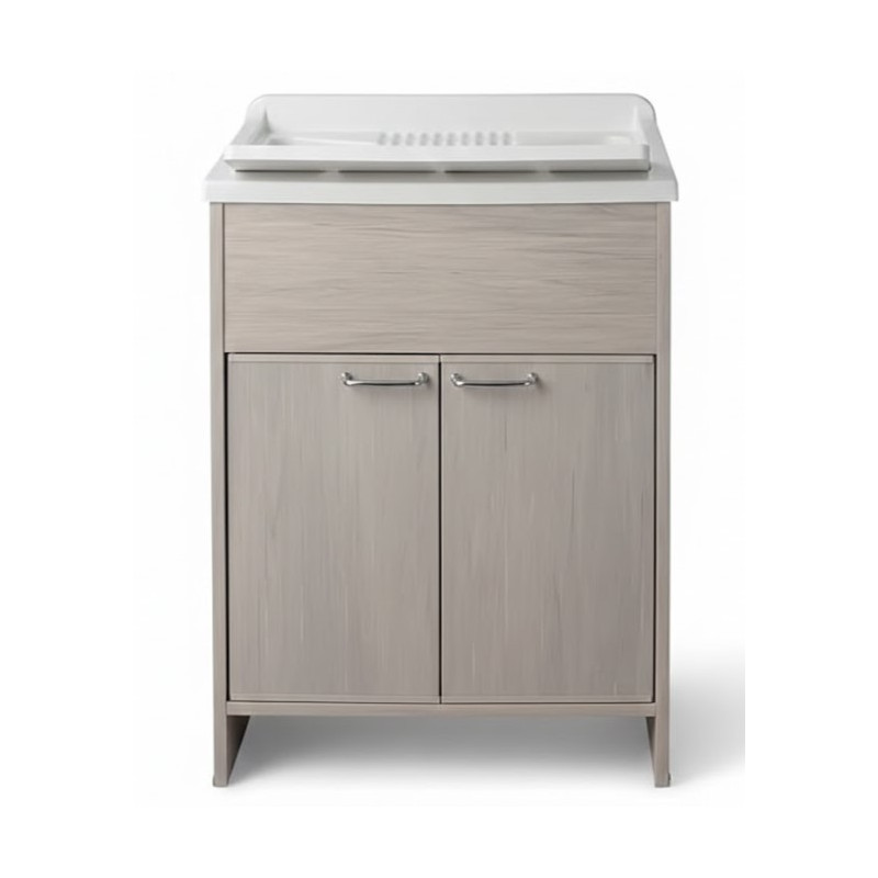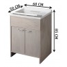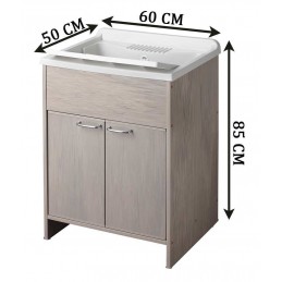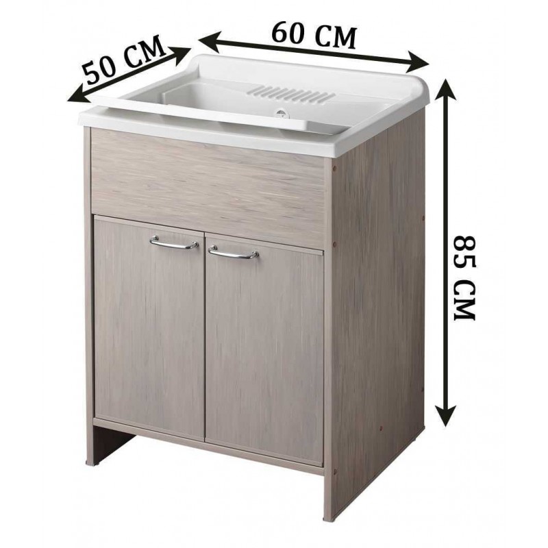 Materiale mobile: Nobilitato idrofugo W100, spessore 18 mmMateriale vasca e asse: Polipropilene resistente agli acidiDimensioni: Larghezza 60 cm, profondità 50 cm, altezza 85 cmColore: BiancoManiglie: CromatePiedini: Regolabili in altezzaRubinetto: Non incluso, vasca predispostaSifone: Autopulente con piletta e troppopienoInstallazione: Da interno