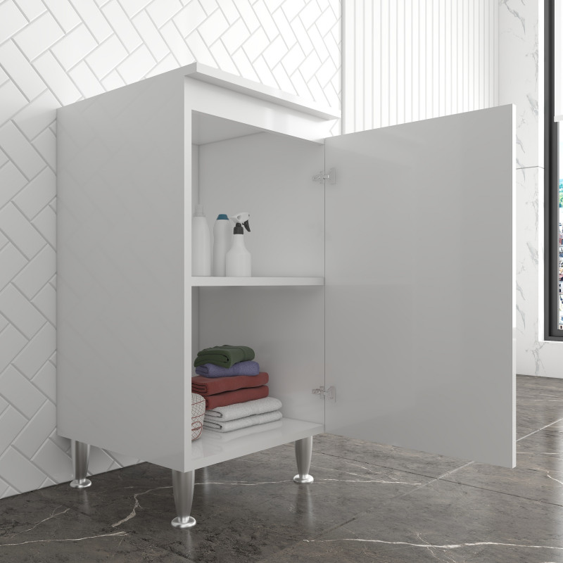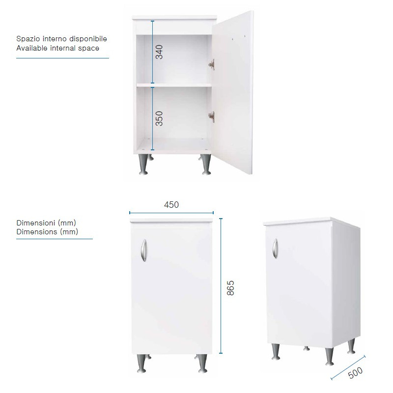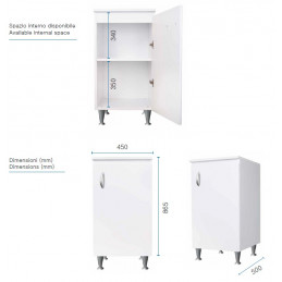 Materiale mobile: Nobilitato idrofugo W100, spessore 18 mmMateriale vasca e asse: Polipropilene resistente agli acidiDimensioni: Larghezza 60 cm, profondità 50 cm, altezza 85 cmColore: BiancoManiglie: CromatePiedini: Regolabili in altezzaRubinetto: Non incluso, vasca predispostaSifone: Autopulente con piletta e troppopienoInstallazione: Da interno