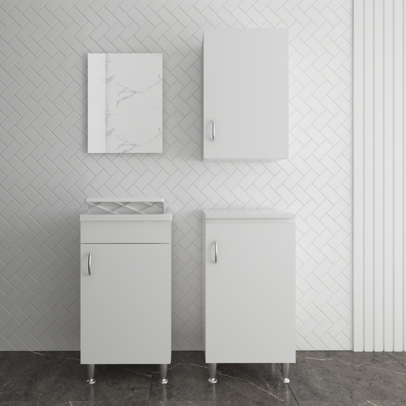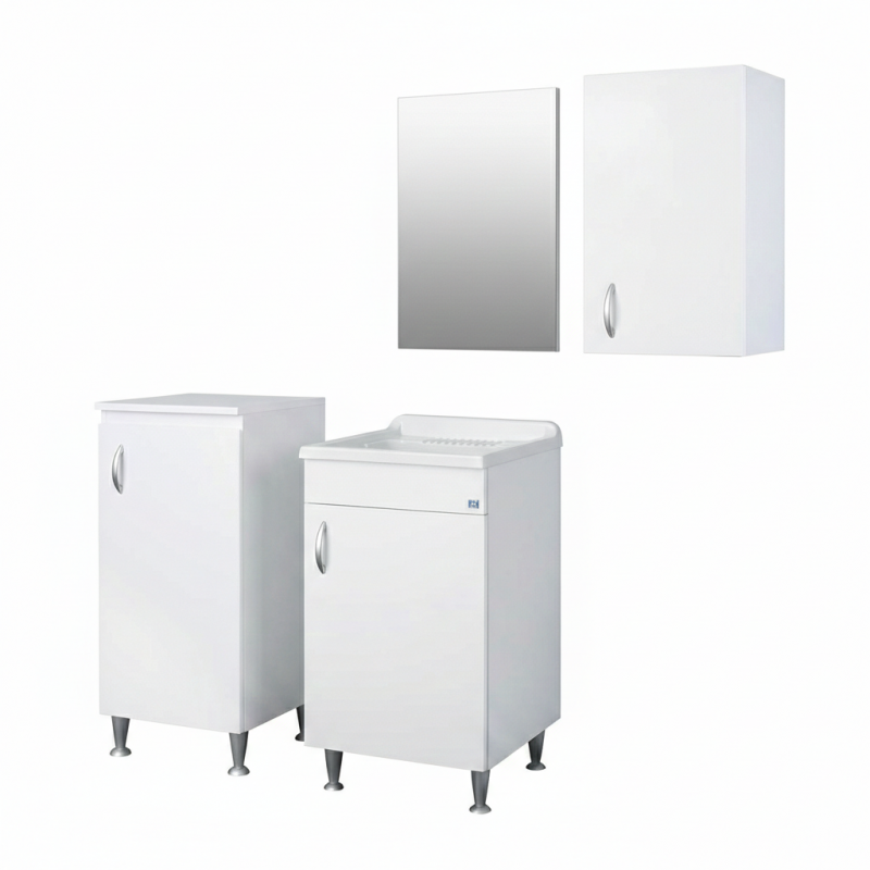 Materiale mobile: Nobilitato idrofugo W100, spessore 18 mmMateriale vasca e asse: Polipropilene resistente agli acidiDimensioni: Larghezza 60 cm, profondità 50 cm, altezza 85 cmColore: BiancoManiglie: CromatePiedini: Regolabili in altezzaRubinetto: Non incluso, vasca predispostaSifone: Autopulente con piletta e troppopienoInstallazione: Da interno