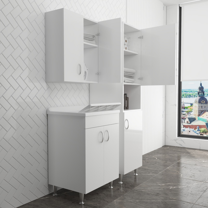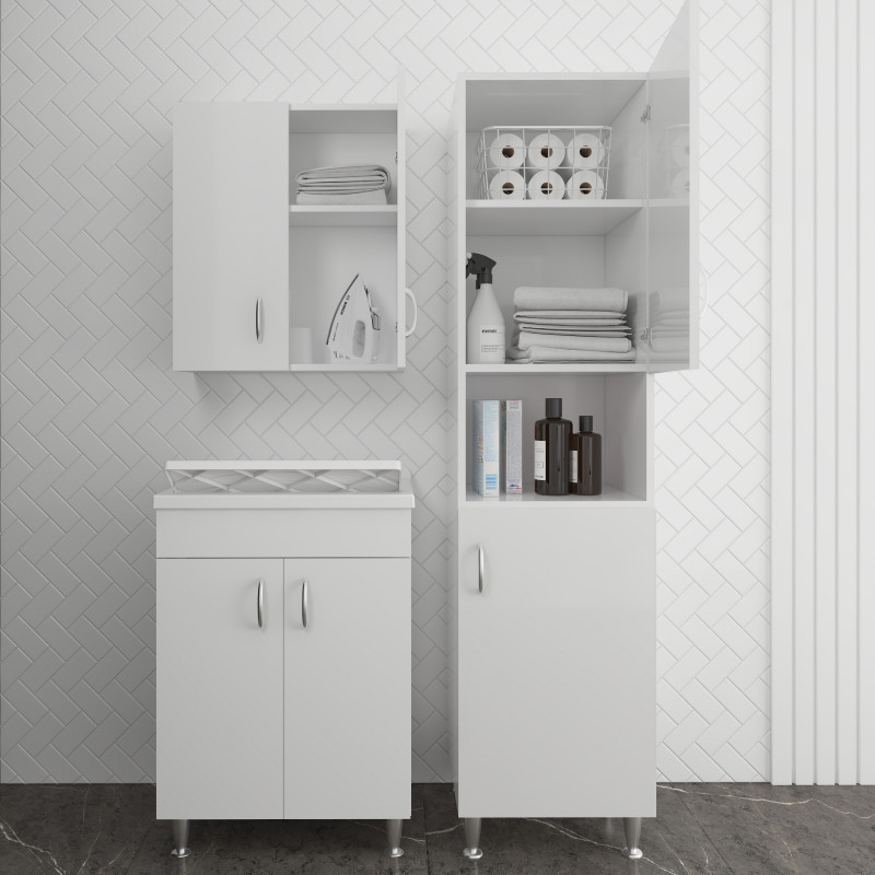 Mobile lavanderia lavatoio in nobilitato idrofugo – Lavatoio 60x50 con colonna e pensile 2 ante – Bianco da interno – Negrari