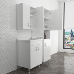 Composizione funzionale per lavanderia composta da lavatoio, colonna e pensile a 2 ante, perfetta per ambienti umidi come bagni o locali lavanderia.