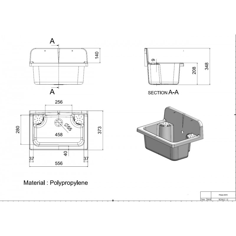 Ideale per ambienti di servizio interni o esterni, offre ampio spazio per lavaggio con foro centrale da 55 mm e predisposizione rubinetto.
