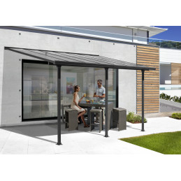 La struttura in alluminio grigio antracite si combina con lastre in policarbonato traslucido da 6 mm, che filtrano i raggi UV mantenendo una luminosità naturale.