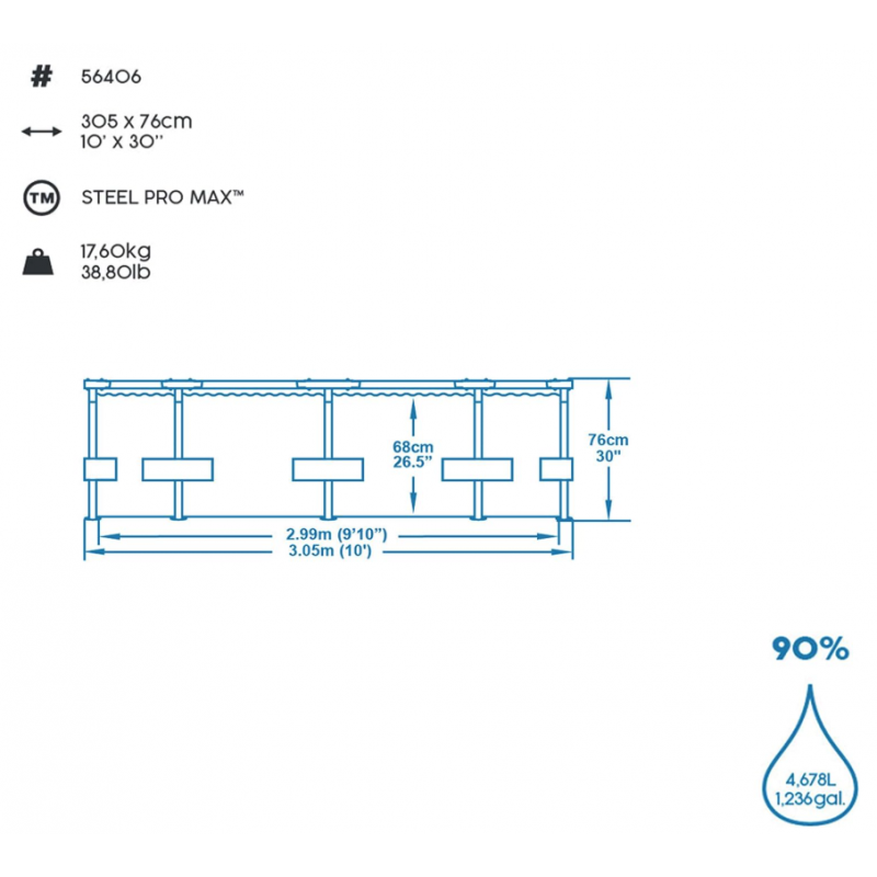 Con diametro di 305 cm e altezza di 76 cm rappresenta una soluzione compatta ideale per famiglie con bambini o per spazi esterni di dimensioni contenute.