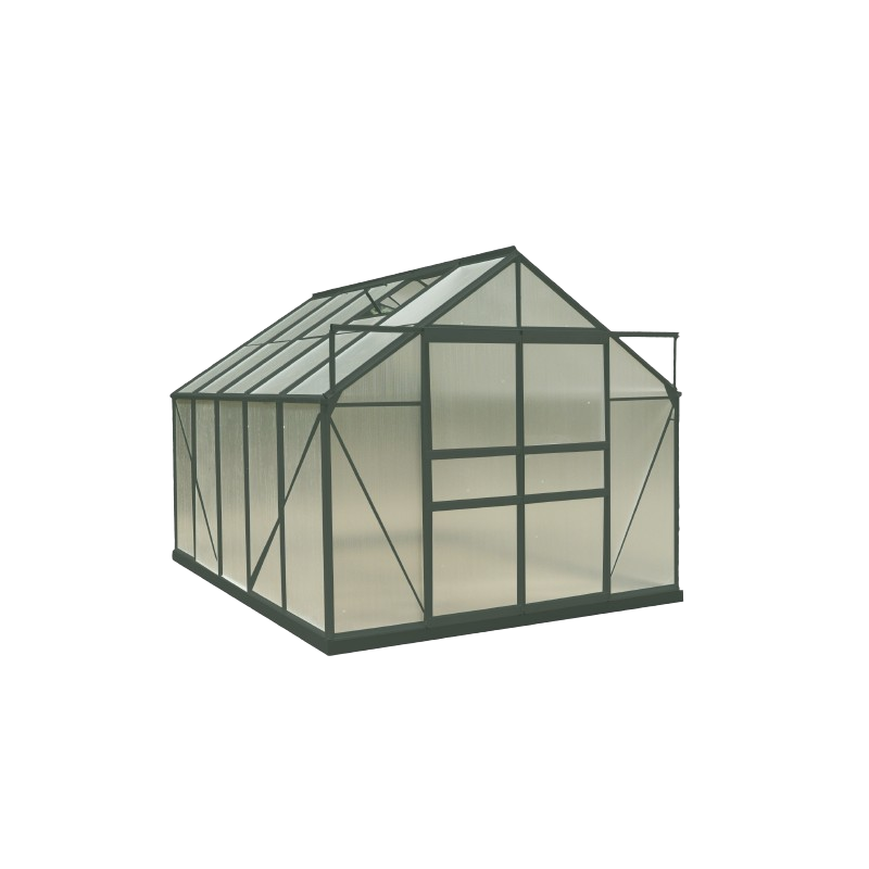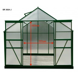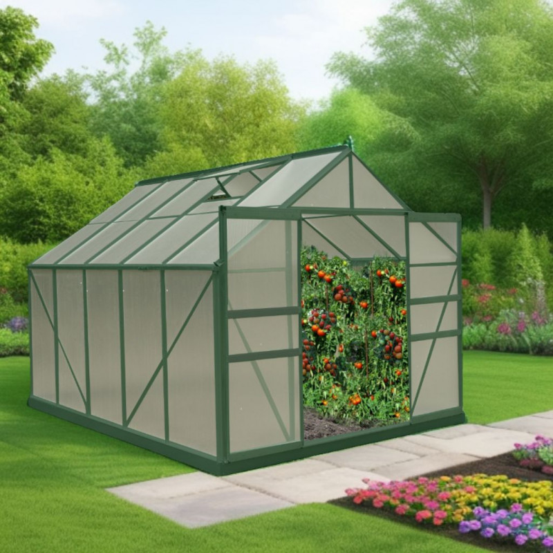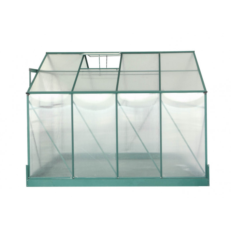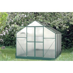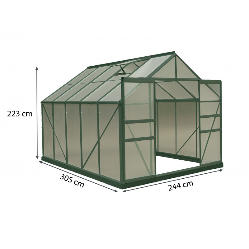 Struttura: alluminio anodizzato anti-corrosioneCopertura: pannelli in policarbonato alveolare spessore 4 mmDimensioni esterne: L 188 x P 127 x H 195 cmSuperficie utile: 2,39 m²Altezza pareti: 127 cmAltezza colmo: 195 cmPorta: singola scorrevole, 60 x 160 cmFinestra: 1 finestra di tetto manualeMontaggio: pannelli a clips, struttura semplice da...