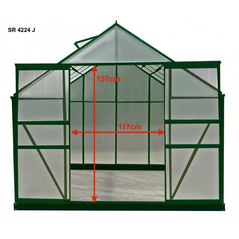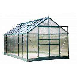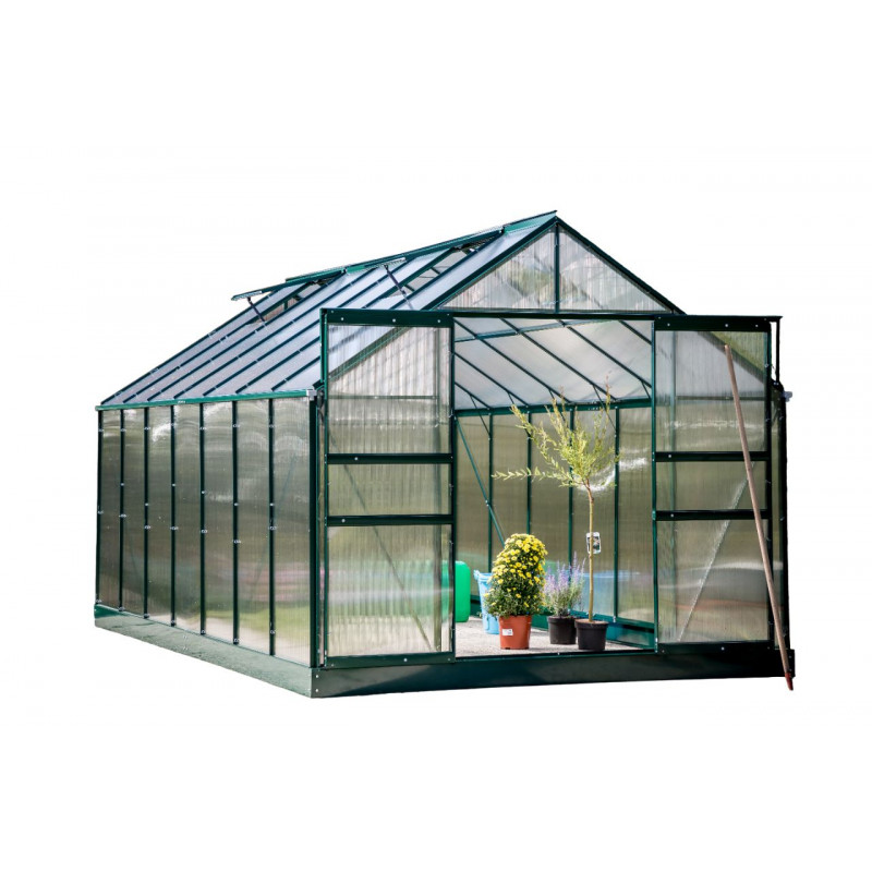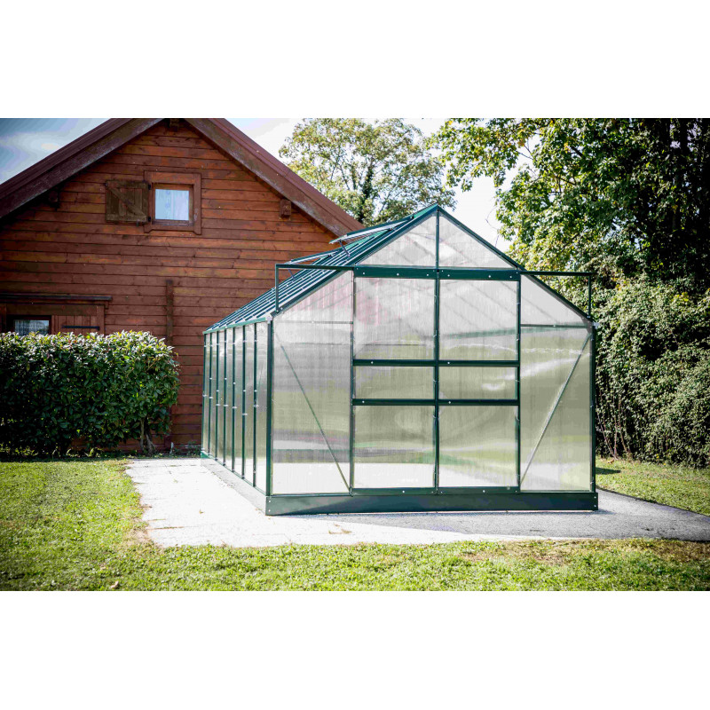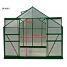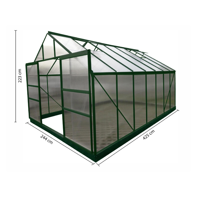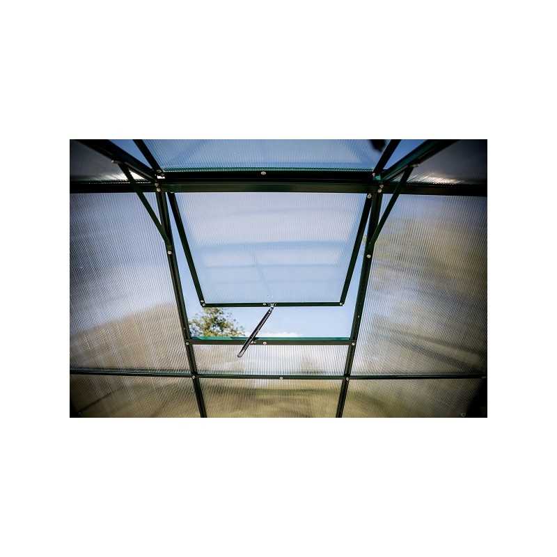 Struttura: alluminio verniciato verdeCopertura: pannelli in policarbonato alveolare 4 mmColore struttura: verdeDimensioni esterne: L 244 x P 305 x H 223 cmAltezza pareti: 139 cmSuperficie utile: 7,44 m²Porta: doppia scorrevole, 117 x 157 cmFinestre: 2 finestre da tetto manualiBase: inclusa, in acciaio zincatoMontaggio: pannelli a clips, istruzioni...