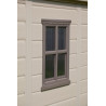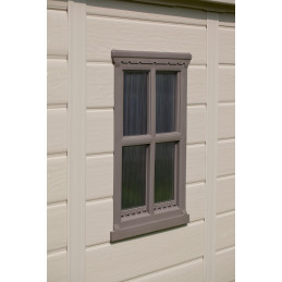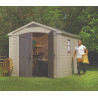 Casetta in Duotech Verniciabile, 2 Porte, Pavimento Incluso, Lucernario e 2 Finestre Frontali in Policarbonato - Dimensioni Esterne Cm. 350X229X254H - Grigio Effetto Legno Naturale