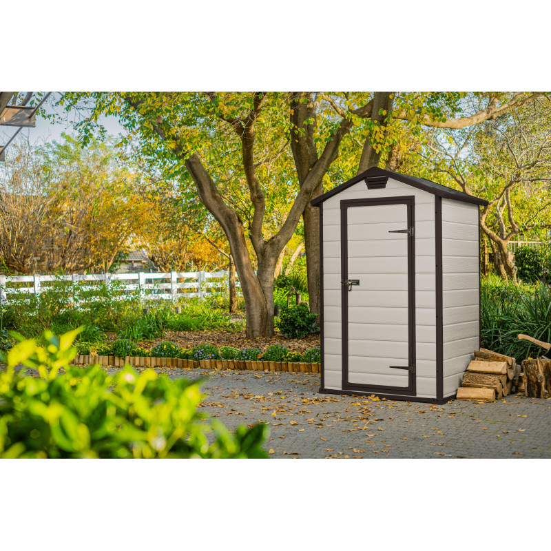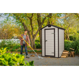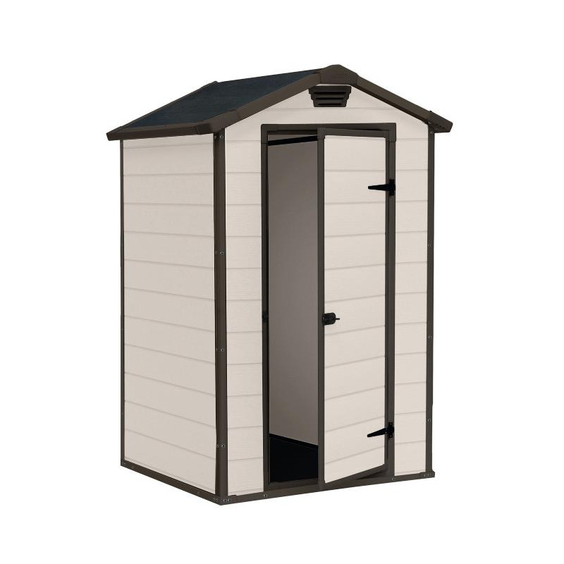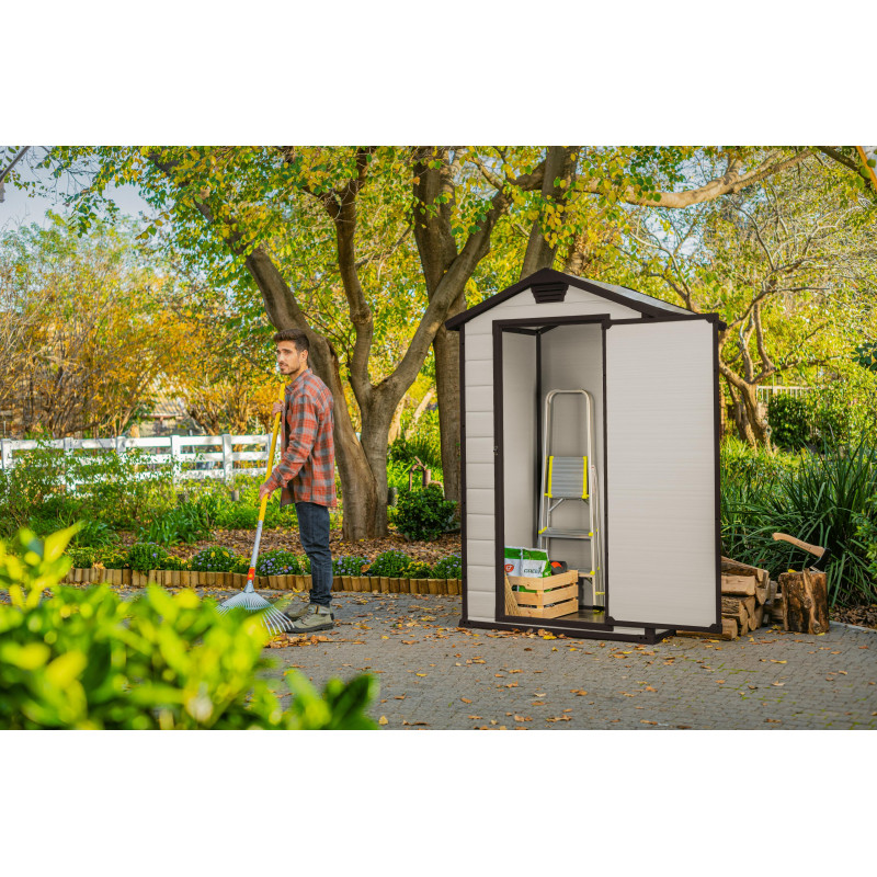 Casetta in Duotech Verniciabile, 2 Porte, Pavimento Incluso, Lucernario e 2 Finestre Frontali in Policarbonato - Dimensioni Esterne Cm. 350X229X254H - Grigio Effetto Legno Naturale
