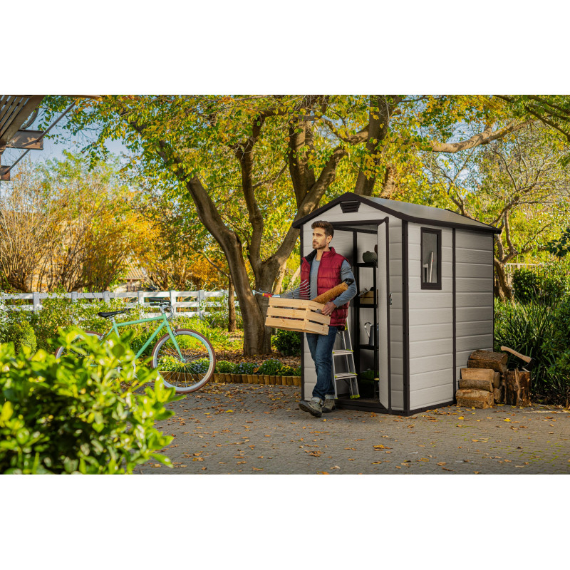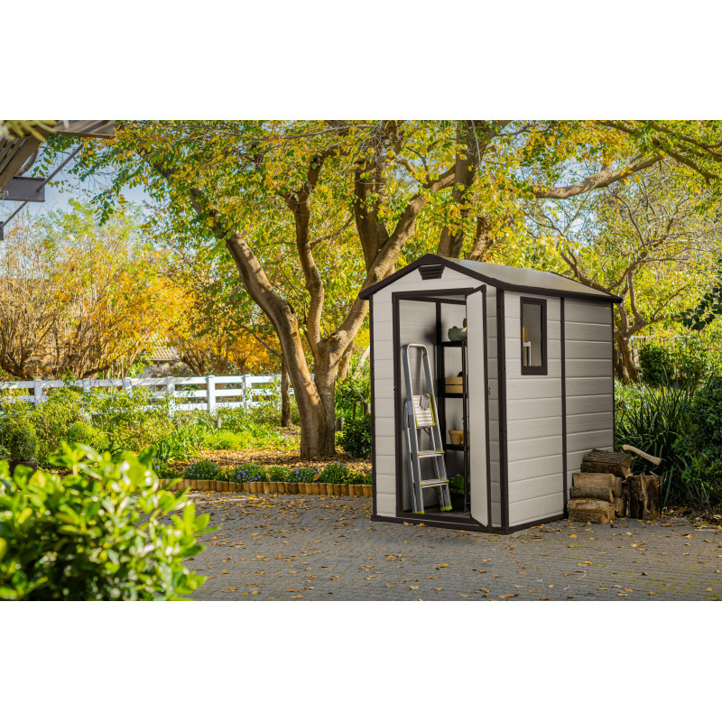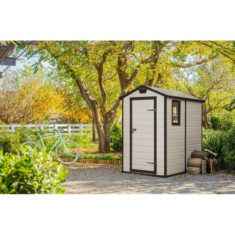 Casetta da giardino in resina effetto legno 130x192x198 cm - con pavimento rialzato e finestra laterale - Beige – Keter