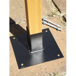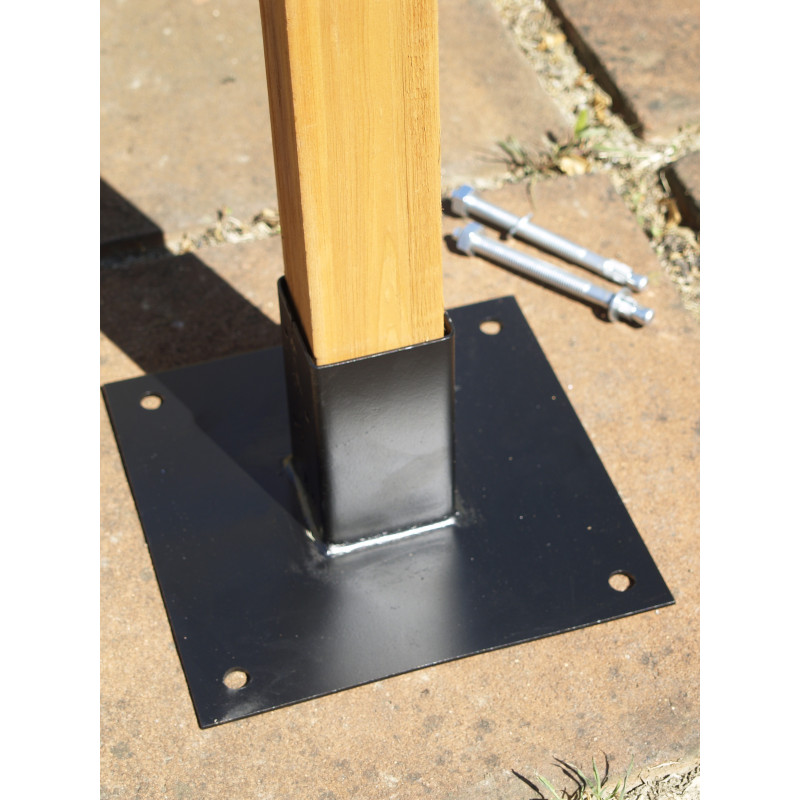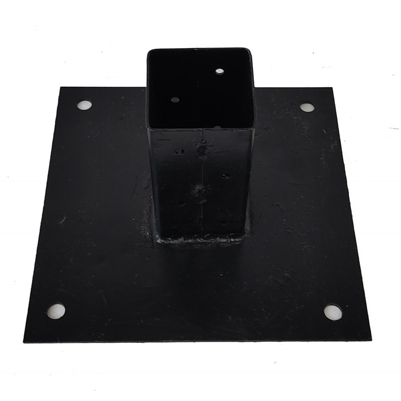 Porta palo in acciaio zincato con finitura nero tramite cataforesi, ideale per fissaggio sicuro of pali in legno su pavimenti o superfici in cemento.