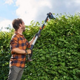 Progettato per la cura di siepi alte e bordure verticali, questo tagliasiepi con pertica a batteria permette di operare comodamente da terra senza ricorrere a scale o piattaforme. L’alimentazione a 20 Volt del sistema PowerShare garantisce libertà di movimento e compatibilità con tutti gli utensili WORX da venti volt. La lama da 45 centimetri con taglio laser assicura precisione e durata, mentre il meccanismo a doppia azione riduce le vibrazioni e migliora la qualità del taglio. La capacità di taglio fino a 16 millimetri di diametro consente di intervenire efficacemente su rami di medio spessore, mantenendo le siepi ordinate e compatte. La prolunga telescopica permette di raggiungere un’altezza di lavoro fino a 3,6 metri, grazie alla combinazione tra corpo macchina e asta estensibile fino a circa 2,8 metri. L’impugnatura ergonomica con angolazione di taglio orientabile facilita il lavoro in diverse posizioni, sia orizzontali sia verticali. Il peso contenuto di circa 3,6 chilogrammi rende l’attrezzo maneggevole e adatto a utilizzi prolungati. La versione .9 viene fornita senza batteria e senza caricabatteria, soluzione ideale per chi possiede già batterie compatibili con la piattaforma WORX PowerShare da venti volt. Inclusi tracolla di supporto e protezione lama.